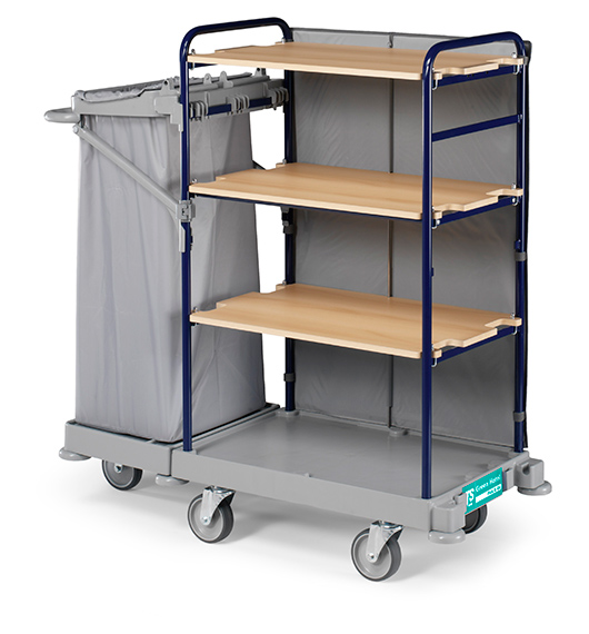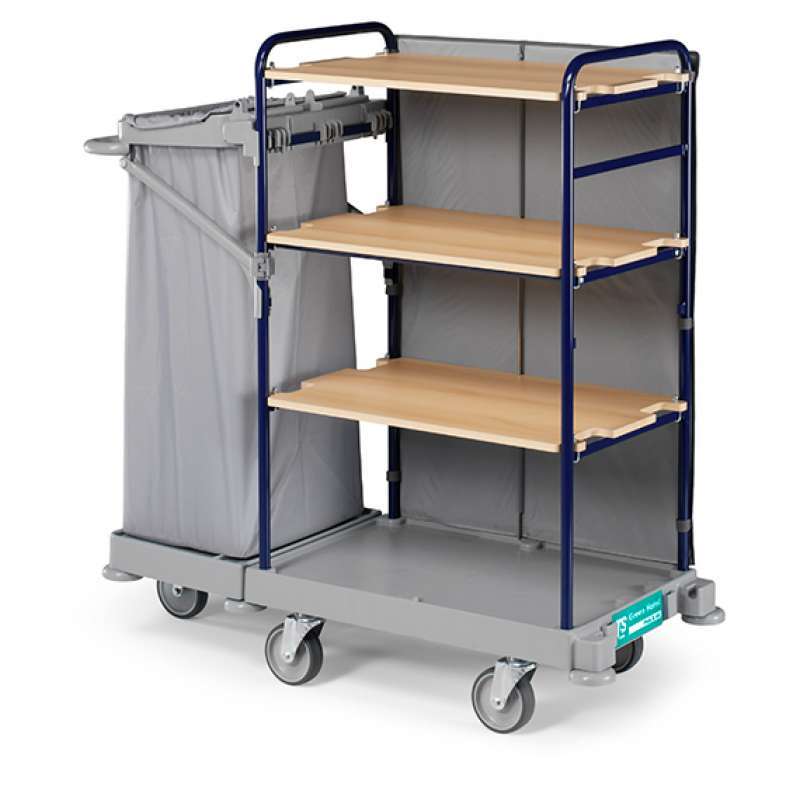 · Equipado con un porta saco plastificado 120L para la recogida de ropa sucia y repisas.
