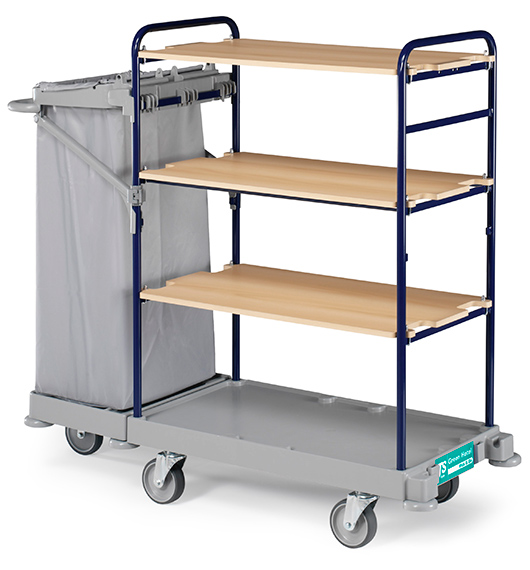 · Equipado con un porta saco plastificado 120L para la recogida de ropa sucia y repisas.