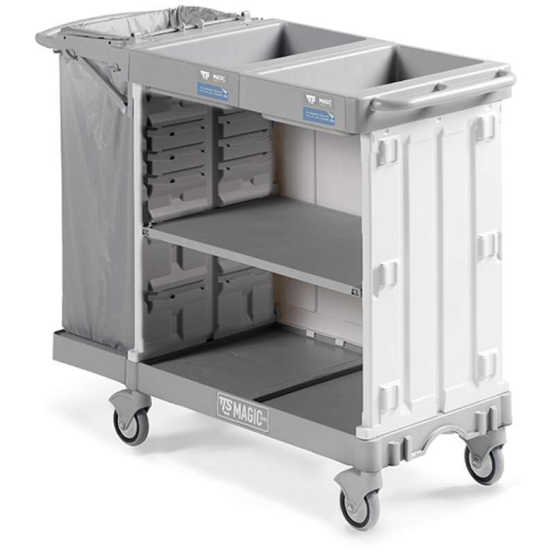 Ruedas Ø 12,5 cmLos carros Magic Hotel, gracias a su diseño moderno, ayuda a fortalecer su imagen, su servicio y profesionalismo, ya que son de gran capacidad, fácil de manejar, compacto, modular y con accesorios. Además contamos con una amplia variedad de carros muy útiles e innovadores tanto para hoteles, como para residencias.