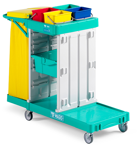 · La cubeta superior transporta 4 cubos de 4L de colores, rojo ,azul, amarillo y verde para la diferenciación de los químicos y de los equipos de limpieza.