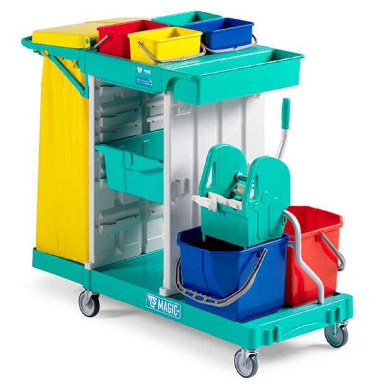 · Carro completo: incluye en la parte superior hay 4 cubos rectangulares con 4L. (amarillo, azul, rojo y verde) y en la parte inferior 2 cubos con asa 15L. cada uno (azul y rojo).