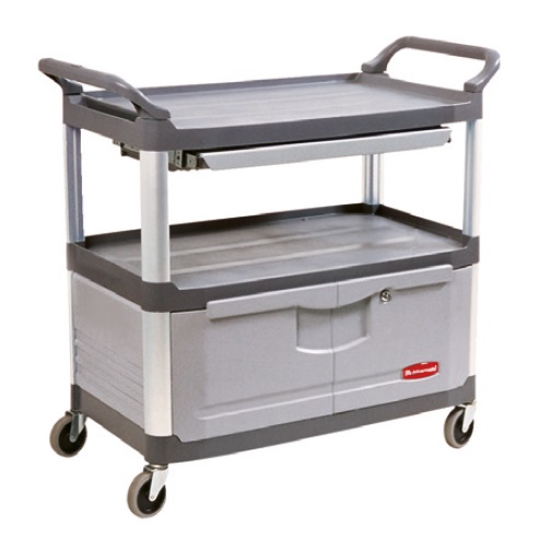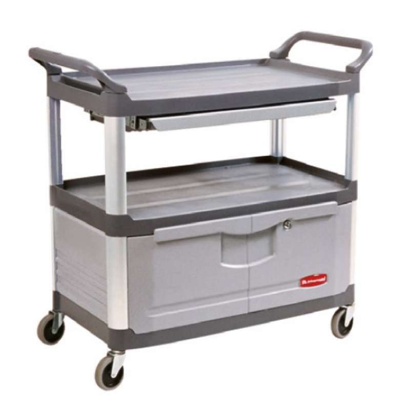 Carro de servicio Rubbermaid con cajón y armario.