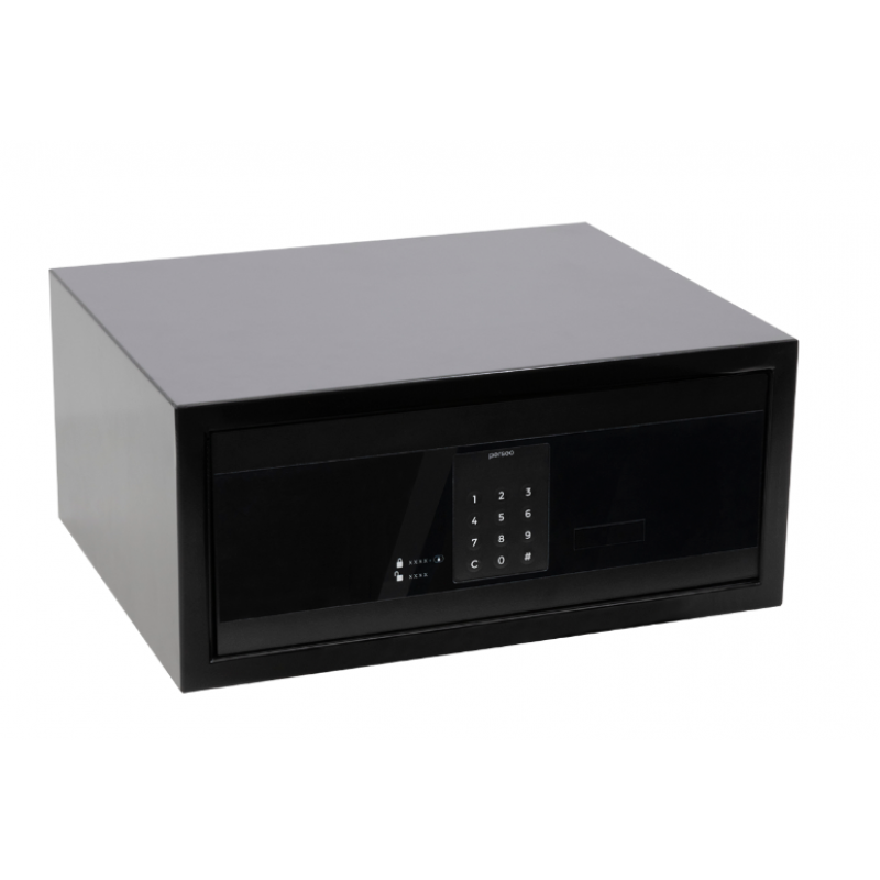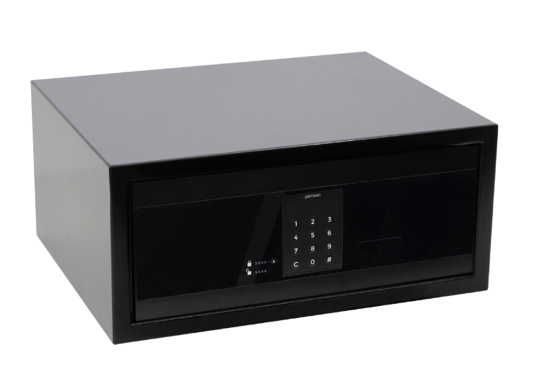 Devido à sua cuidadosa concepção. A sua porta está acabada em metacrilato brilhante, o que reflecte a luz e lhe confere uma aparência muito atractiva que reforça o conceito de segurança do cofre. Ideal para os hotéis mais exigentes.